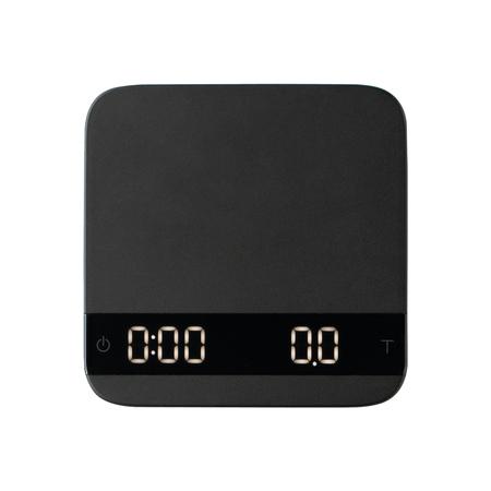 3. Opcja oznaczona ikoną kropli. Czas zacznie być odmierzany automatycznie przy pierwszym kontakcie kawy z naczyniem postawionym na wadze. Idealna do odmierzania czasu przy parzeniu espresso. Licznik przepływu jest także aktywny.
