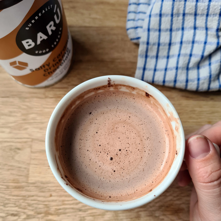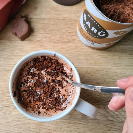 BARÚ Salty Caramel Hot Chocolate to idealne połączenie gorącej czekolady z kawałkami solonego karmelu, które rozpuszczają się w filiżance. Łatwa w przygotowaniu – wystarczy dodać gorące mleko lub jego roślinne alternatywy. Jedno opakowanie wystarcza na przygotowanie 12 filiżanek pysznej gorącej czekolady!