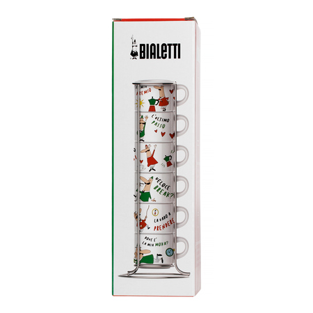 Komplet 6 filiżanek Bialetti, przeznaczonych do espresso. Naczynia są wykonane z grubej porcelany w kolorach włoskiej flagi, a każda z filiżanek jest ozdobiona logo Bialetti. Filiżanki można przechowywać w wygodny sposób jedna na drugiej na dołączonym stojaku.