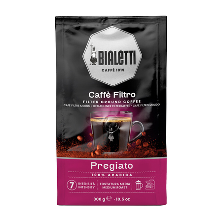Bialetti Caffe Filtro Pregiato to kawa mielona o średnim profilu palenia. To 100% Arabika o delikatnym smaku, o wyczuwalnych nutach kwiatów oraz suszonych owoców.