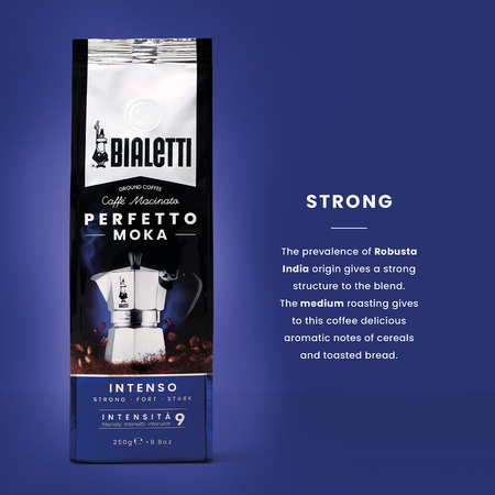 Bialetti Perfetto Moka Intenso to kawa mielona o ciemnym profilu palenia. Mieszanka robusty z Indii (70%) i arabiki (30%) o intensywnym smaku, o wyczuwalnych nutach kakao i pieczonego chleba.