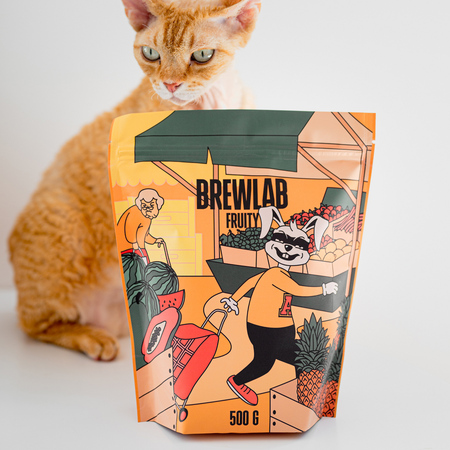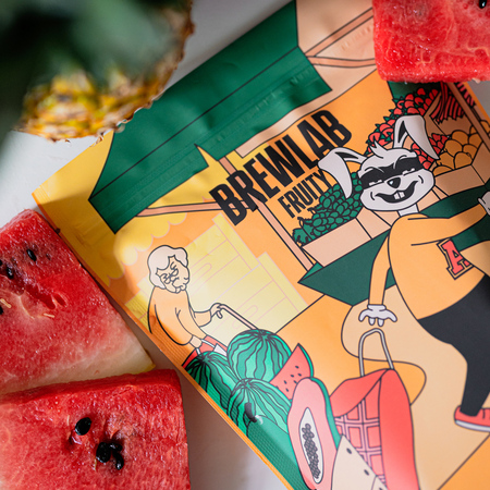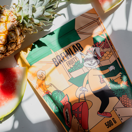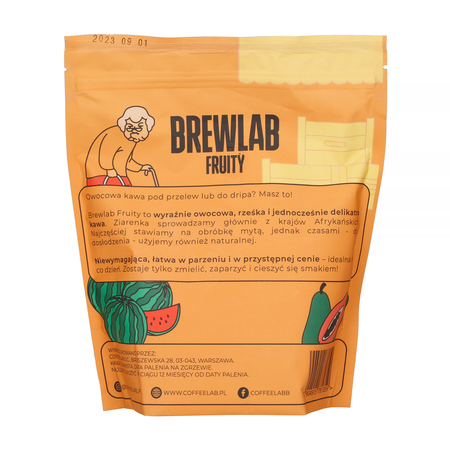 Kilka słów o kawie od Coffeelab: „Brewlab Fruity to wyraźnie owocowa, rześka i delikatna kawa. Ziarenka sprowadzamy głównie z krajów afrykańskich. Najczęściej stawiamy na obróbkę mytą, jednak czasami – dla dosłodzenia – użyjemy również naturalnej