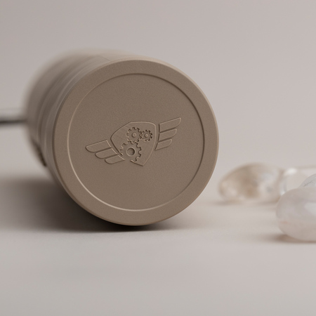 Materiały te są zaprojektowane tak, aby wytrzymać lata intensywnego użytkowania. W przypadku przenośnego młynka wybór odpowiedniego materiału do budowy korpusu miał kluczowe znaczenie. W wyniku badań w laboratoriach i testów w terenie wybrano kompozyt QTP®. To wysokowydajny technopolimer wzmocniony kwarcem, który w dotyku przypomina ceramikę. Został opracowany do zastosowania w mechanice i inżynierii oraz jest bezpieczny w kontakcie z żywnością. Obudowa jest ozdobiona geometrycznym wzorem.
