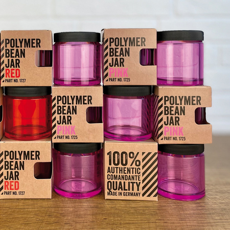 Różowy słoik z polimeru jest bezpieczny w kontakcie z żywnością, wytrzymały, lekki i uczyni Twój młynek Comandante jeszcze bardziej wyjątkowym! Słoik jest kompatybilny z młynkami Comandante MK3 i MK4.