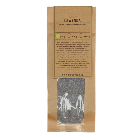 Dworzysk Lawenda to suszone kwiaty lawendy bez dodatków. Może posłużyć do przygotowania naparu na ciepło, na zimno lub odwaru do kąpieli. Kwiaty lawendy mają w sobie dużo olejku eterycznego, którego zapach wydziela się przez delikatne zgniatanie kwiatków. To świetna baza do naparów i lemoniad ziołowych. Lawenda używana jest też w kuchni jako przyprawa. Według medycyny ludowej picie lawendy wycisza, uspokaja, łagodzi napięcie nerwowe, ułatwia zasypianie. Pomaga w stanach zapalnych górnych dróg oddechowych oraz w prawidłowym trawieniu. Kąpiel w lawendzie relaksuje i oczyszcza skórę.