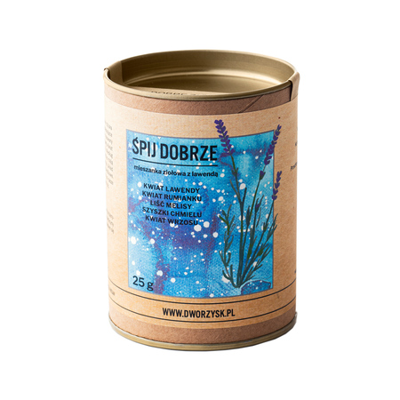 Dworzysk Śpij Dobrze to ziołowa mieszanka na lepszy sen. Może posłużyć do przygotowania naparu na ciepło lub odwaru do kąpieli. Według medycyny ludowej lawenda, rumianek, melisa, chmiel i wrzos mają właściwości wyciszające i odprężające. Zioła te regulują układ nerwowy i trawienny. Lawenda jest polecana przy stanach niepokoju. Rumianek działa łagodząco i rozkurczowo. Melisa posiada właściwości uspakajające i jednocześnie wzmacniające. Wyciąg z szyszek chmielu jest stosowany w stanach wzmożonego napięcia i nadpobudliwości nerwowej. Kwiaty wrzosu są pomocne przy problemach z bezsennością. To dobry napar do picia przed snem. Działa korzystnie na nasze samopoczucie, pomaga się odprężyć i spokojnie przespać noc.