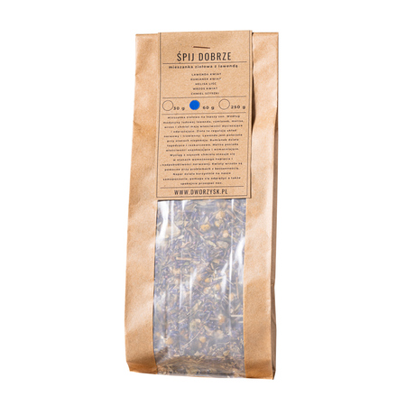Dworzysk Śpij Dobrze to ziołowa mieszanka na lepszy sen. Może posłużyć do przygotowania naparu na ciepło lub odwaru do kąpieli. Według medycyny ludowej lawenda, rumianek, melisa, chmiel i wrzos mają właściwości wyciszające i odprężające. Zioła te regulują układ nerwowy i trawienny. Lawenda jest polecana przy stanach niepokoju. Rumianek działa łagodząco i rozkurczowo. Melisa posiada właściwości uspakajające i jednocześnie wzmacniające. Wyciąg z szyszek chmielu jest stosowany w stanach wzmożonego napięcia i nadpobudliwości nerwowej. Kwiaty wrzosu są pomocne przy problemach z bezsennością. To dobry napar do picia przed snem. Działa korzystnie na nasze samopoczucie, pomaga się odprężyć i spokojnie przespać noc.