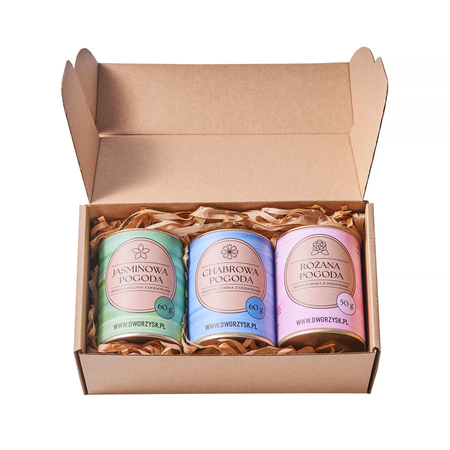 Nowe herbaty z Dworzyska w zestawie Kwiaty Pogody oznaczają, że na niebie przez cały dzień będzie świecić słońce. Już od rana słoneczna aura zielonej herbaty Sencha i pąków jaśminu, zawartych w Jaśminowej Pogodzie sprawią, że niebo będzie jasne i pełne blasku. Synoptycy zapowiadają również Chabrową Pogodę, w trakcie której termometry wskażą wysokie wartości czarnej herbaty Ceylon z naturalnym aromatem bergamotki. Z Dworzyska nadchodzi także wyż atmosferyczny, który przynosi Różaną Pogodę. Tego dnia w powietrzu unosić się będzie delikatny zapach białej herbaty. Na pogodę wpływać będą również kwiaty róży i brzoskwini. Zestaw Kwiaty Pogody sprawi, że to będzie przyjemny dzień. Herbaty dobrze smakują zarówno na ciepło jak i na zimno.