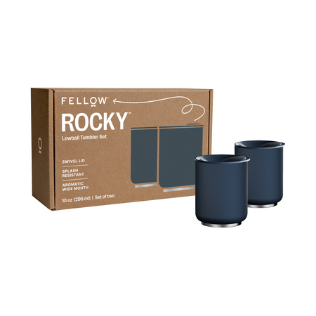 Zestaw dwóch kubków Fellow Rocky Lowball Tumbler. Kubek termiczny Fellow Rocky, idealny do picia w każdych warunkach. Model Rocky posiada ceramiczną powłokę wewnętrzną, dociążoną podstawę, pojemność 295 ml, wygodny kształt i pokrywkę oraz cienką krawędź, zapewniając pełne doznania sensoryczne gorących i zimnych napojów. Szeroki otwór pozwala na łatwe dodanie kostek lodu, dzięki czemu kubek jest też odpowiedni do wszelkich koktajli.