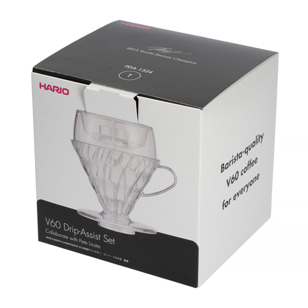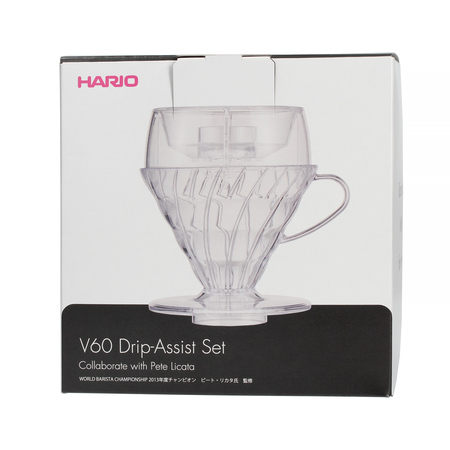 Zestaw składający się z drippera Hario V60-02 z tworzywa sztucznego, nakładki na dripper Hario Drip-Assist oraz 40 sztuk papierowych filtrów. To doskonały zestaw zarówno dla początkujących kawoszy, jak i tych bardziej zaawansowanych entuzjastów kawy.