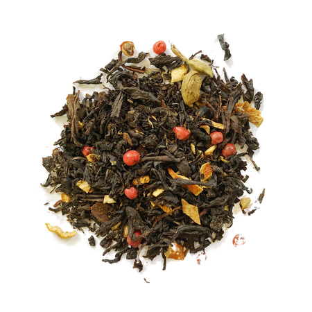 Składniki: herbata czarna: Assam, Cejlon, Kenia, kora cynamonu, pieprz czerwony, kardamon, imbir, goździki, suszona skórka pomarańczy, aromat naturalny.