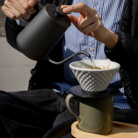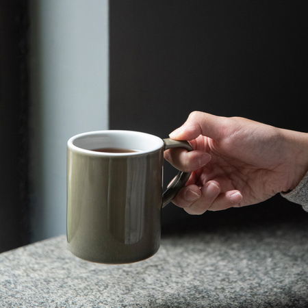 Kubek łączy w sobie nowoczesny design z tradycyjnym charakterem. Grube ścianki i przestrzeń na powietrze pod dnem zapewniają utrzymywanie odpowiedniej temperatury kawy przez długi czas. Zaokrąglony kształt dna pozwala na optymalne wydobycie smaku. Naczynia wykonane są z najwyższej klasy porcelany wypalanej w temperaturze 1300℃.