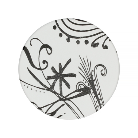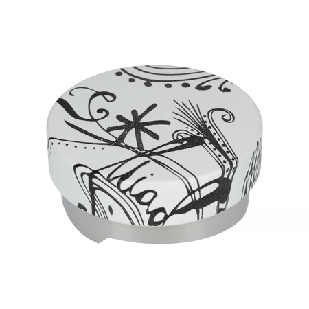Dystrybutor jest wykonany solidnie z wysokiej jakości stali nierdzewnej i tworzywa sztucznego. Górny element ozdobiony czarno-białym wzorem.