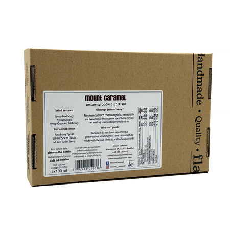 Zestaw syropów Mount Caramel stworzony z myślą o miłośnikach kawy, herbaty i słodkich deserów, pragnących dodać swoim specjałom wyjątkowego smaku i charakteru. Zestaw jest zapakowany w kartonik prezentowy i zawiera trzy smaki: malina, glogg oraz grzaniec jabłkowy, każdy zamknięty w 100ml szklanej buteleczce.