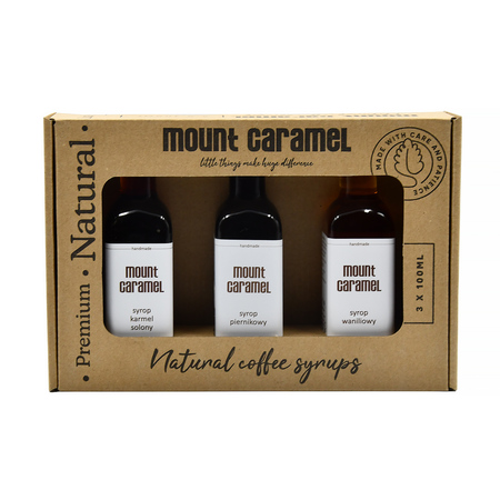 Zestaw syropów Mount Caramel stworzony z myślą o miłośnikach kawy, herbaty i słodkich deserów, pragnących dodać swoim specjałom wyjątkowego smaku i charakteru. Zestaw jest zapakowany w kartonik prezentowy i zawiera trzy smaki: piernik, solony karmel oraz wanilia, każdy zamknięty w 100ml szklanej buteleczce.