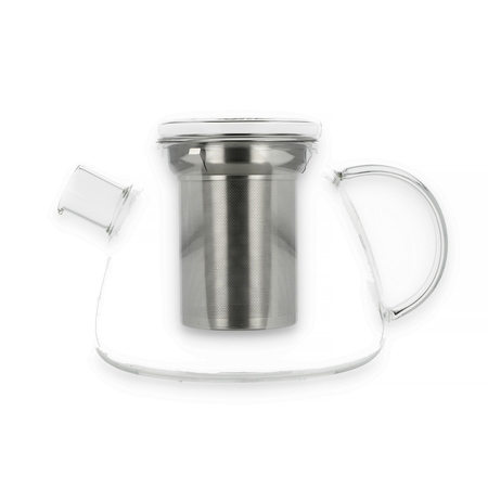 Czajniczek ze szkła borokrzemowego ze zdejmowanym sitkiem i pokrywką.
