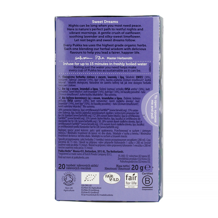 Znajdź ukojenie przed snem dzięki herbacie Pukka Night Time. Ta wyjątkowa mieszanka ziół na dobranoc – rumianku, lawendy i kozłka lekarskiego – sprawi, że w naturalny sposób odpłyniesz w błogi sen. Herbata Night Time, stworzona przez ekspertów zajmujących się ziołami i dietetyków, łączy najnowsze badania naukowe z tradycyjnie wykorzystywanymi właściwościami roślin, aby przynieść naturalne odprężenie.