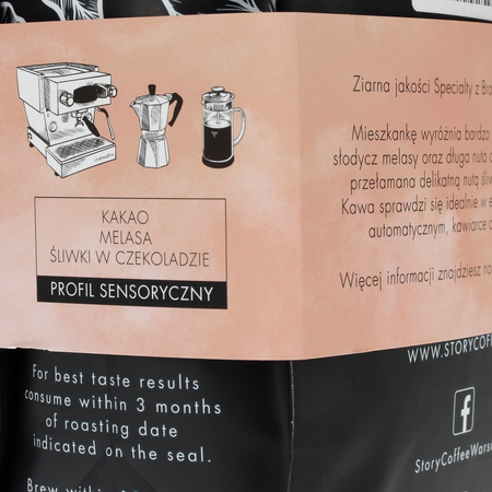 Mieszanka kaw ziarnistych jakości specialty pochodzących z Brazylii i Hondurasu, wypalana w warszawskiej palarni Story Coffee Roasters. Ziarno palone w ciemnym stopniu, przeznaczone do ekspresów automatycznych, espresso i kawiarek. Kawa o wielowarstwowej słodyczy przypominającej kakao, melasę oraz śliwki w czekoladzie – świetna zarówno w pojedynkę, jak i z dodatkiem mleka.