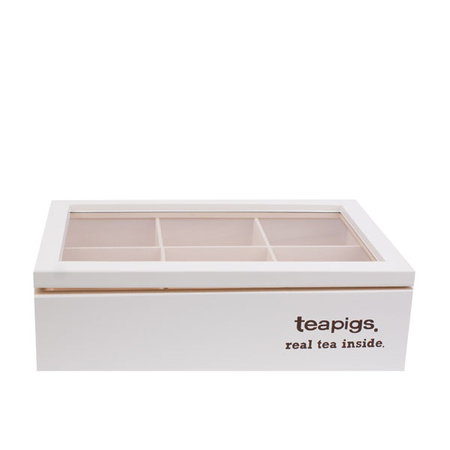 Skrzynka posiada sześć przegródek, dzięki którym wyeksponujesz swoje ulubione smaki herbat Teapigs. Każda z przegródek mieści 6-8 kopert.