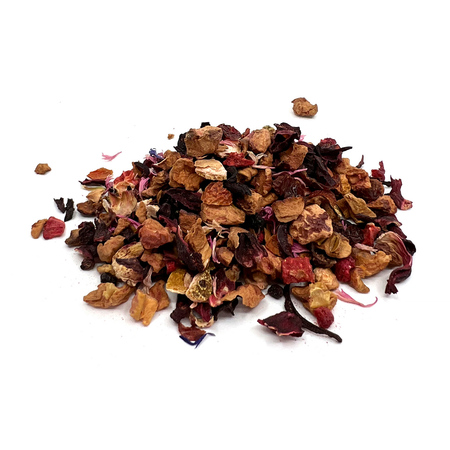 Składniki: jabłko, kwiat hibiskusa, owoc dzikiej róży, skórka pomarańczy, owoc czarnego bzu, malina, truskawka, kwiat chabru.