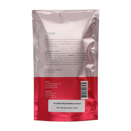 Moomin Rooibos Red Berries to sypana herbatka aromatyzowana liściasta opracowana przez szwedzką firmę Teministeriet. Już oryginalne opakowanie z uroczą postacią ze świata Muminków sugeruje, ze gorący napar z tej herbaty liściastej stanie się niezapomnianą ucztą dla podniebienia. Dzięki optymalnie zbilansowanym proporcjom składników finalnego produktu — herbatki rooibos, papai, ananasa, porzeczki, płatków róż oraz truskawki i maliny — można rozkoszować się wyśmienitym smaku i przyjemnym wyrazistym aromatem. Fascynująca mieszanka urozmaici niejedno spotkanie w gronie rodziny lub znajomych. Oryginalny bukiet smakowy sprawi, ze każdy łyk tej znakomitej herbaty liściastej przypomni przygodę w świecie Muminków.