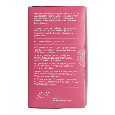 Supertea to seria organicznych herbat i ziół, stworzona przez szwedzką markę Teministeriet. Każde opakowanie zawiera 20 oddzielnych saszetek, w których kryją się torebki z herbatą – biodegradowalne, wykonane z dbałością o środowisko. Mnóstwo naturalnych składników, ogrom smaku i moc aromatu!