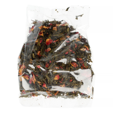 Green Tea Raspberry jest mieszanką zielonej herbaty aromatyzowanej z dodatkiem porzeczek, płatków róż, ananasem, papai, truskawki i maliny. Szczególnie wyczuwalna jest malina.