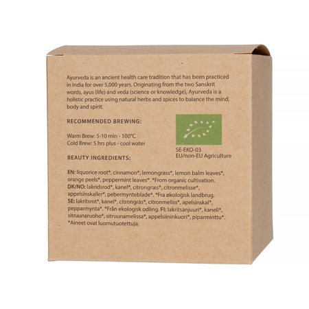 Teministeriet Ayurveda Beauty Organic to ziołowa herbata sypana. Mieszanka ziół, sporządzona ze składników pochodzących z upraw organicznych. Jego pozbawiona kofeiny formuła została wzbogacona korzeniem lukrecji, cynamonem, melisą i ziołami ajurwedy, aby pomóc Ci się zrelaksować i odprężyć. Cieszy się delikatną i uspokajającą herbatą.