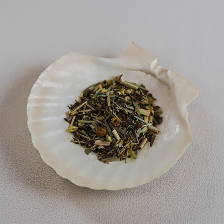 Składniki: trawa cytrynowa*, korzeń lukrecji*, kawałki jabłka*, mięta pieprzowa*, kwiaty rumianku*, liście truskawki*, koper włoski*, kwiaty lipy*, kwiaty nagietka*.