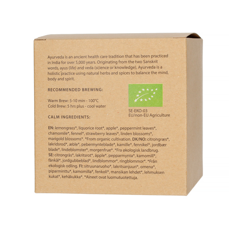 Teministeriet Ayurveda Calm Organic to ziołowa herbata sypana. Mieszanka ziół, specjalnie przygotowana w celu zapewnienia relaksu, zawierająca organiczną trawę cytrynową, korzeń lukrecji, jabłko i zioła ajurwedy. Formuła pozbawiona kofeiny stanowi odżywczy ziołowy środek relaksujący i zapewniający poczucie spokoju.