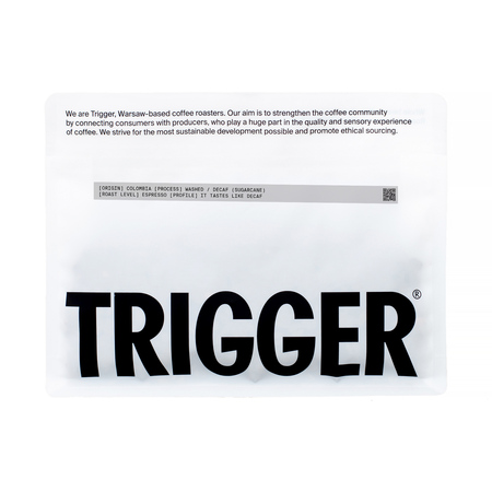 Bezkofeinowa kawa ziarnista jakości specialty pochodząca z Kolumbii, wypalona przez Trigger. Palona w ciemnym stopniu, idealna do ekspresu ciśnieniowego lub kawiarki.