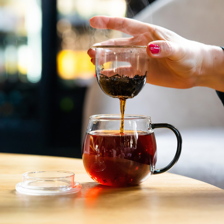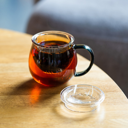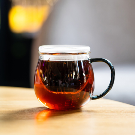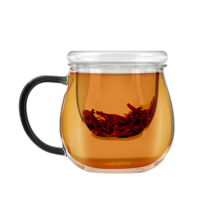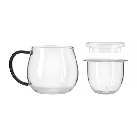 Duża pojemność pozwoli delektować się sporą porcją gorącej i aromatycznej herbaty, a komfort degustacji zapewni szerokie i poręczne uszko w kolorze grafitu. Transparentne szklane ścianki umożliwiają śledzenie procesu zaparzania i kontroli intensywności herbaty.