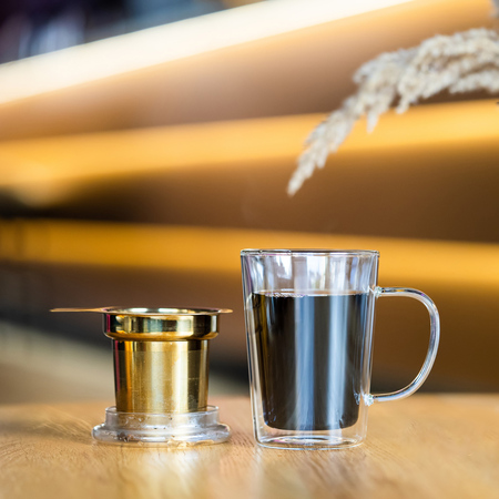 Szklanka z zaparzaczem Amo o pojemności 300 ml marki Vialli Design. Elegancka i praktyczna szklanka posiadająca w środku wyjmowany zaparzacz wykonany ze stali nierdzewnej w kolorze złotym, do którego wsypujemy herbatę liściastą lub granulowaną. Podwójne ścianki pomagają zachować odpowiednią temperaturę na dłużej, możemy więc cieszyć się gorącym napojem, dodatkowo zewnętrzna ścianka izoluje nasze ręce przed ciepłem.