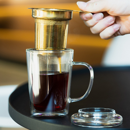 Zaparzacz posiada bardzo drobne perforacje, które umożliwiają swobodną cyrkulację naparu oraz wygodny uchwyt uławiający wyciąganie. Filtr zatrzymuje fusy w środku, pozostawiając klarowną herbatę w szklance. Szklana pokrywa może po odwróceniu służyć jako spodek do odstawienia zaparzacza.