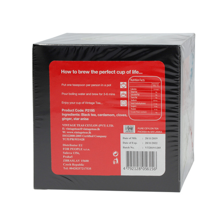 Skład: czarna herbata, kardamon, goździki, imbir, gwiazdki anyżu.