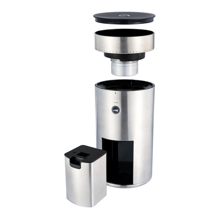 Pojemnik na zmieloną kawę został wykonany ze stali nierdzewnej. Zapobiega to elektryzowaniu, przez co kawowy pył nie unosi się i nie osadza na kuchennych blatach.